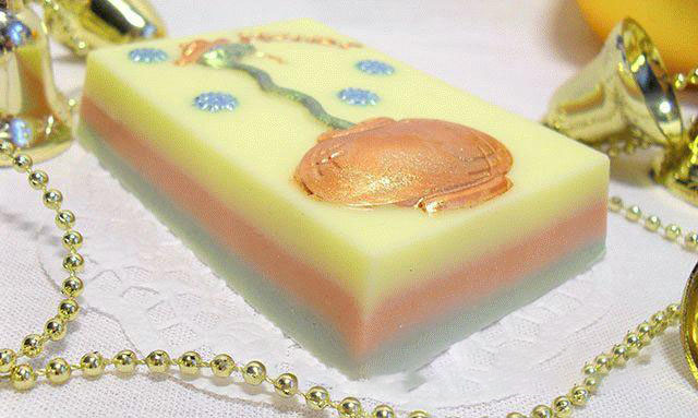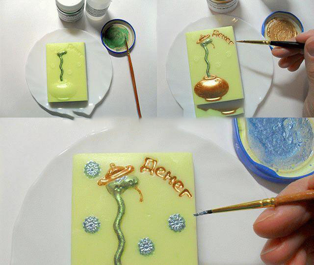 13. Осталось разукрасить змейку и узор на мыле, для этого применяйте особые перламутровые пигменты: разложите маленькое количество порошка в плоскую емкость, добавьте несколько капель спирта и тщательно перемешайте. Тонкой кисточкой нанесите получившуюся краску на все детали рисунка: змейку раскрасьте зеленым перламутром, горшок и надпись обозначьте бронзовым порошком, а снежинки и зрачки змеи — голубым