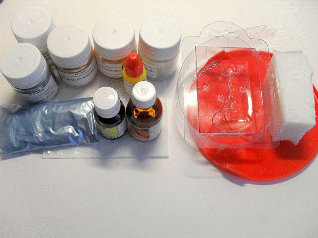Для работы пригодится: белая мыльная основа пластиковая форма для мыла косметическое миндальное масло эфирное масло «Лимон» пигменты желтого, красного и зеленого цветов перламутровые пигменты: «Бронза», зеленый, голубой средство для удаления пузырьков емкости для плавления и работы с красками кисточки