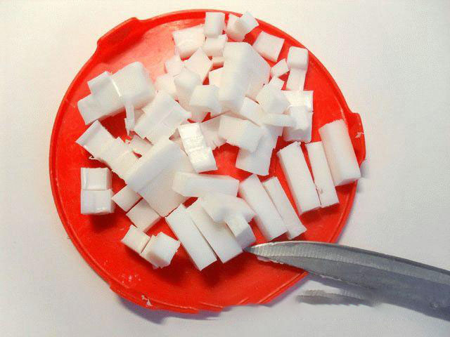 1. Для изготовления данного мыла пригодится 70 грамм мыльной основы. Нарежьте её маленькими кубиками и поделите примерно на три равные части