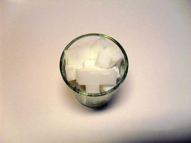 2. Разложите первую часть мыльной нарезки в емкость для плавления, к примеру в стопку, расплавьте в микроволновой печи на большом режиме