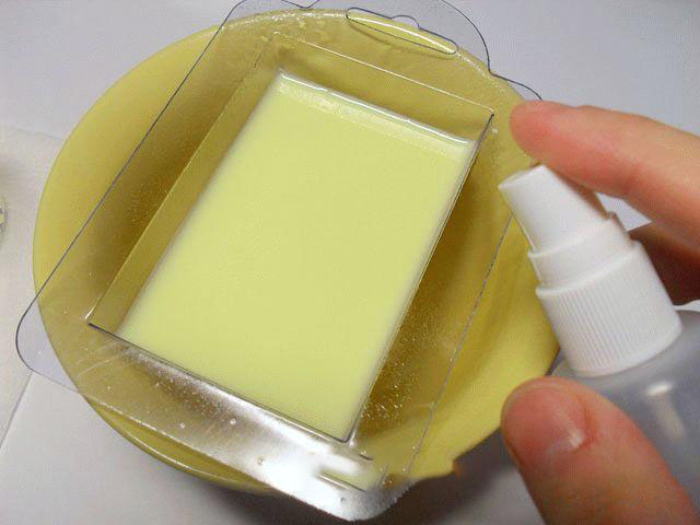12. Наполните форму основой до самого края, сбрызните средством для удаления пузырьков и оставьте до полного застывания — минимум на один час. Мыло готово, в то время, когда оно станет всецело холодным. Брусок должен отлично отходить от стенок формы, лишь в этом случае извлеките его и положите на ровную поверхность, комфортно применять тарелку