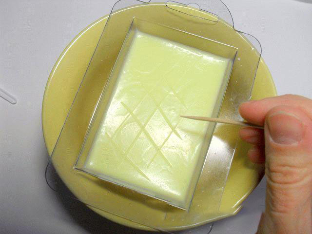 7. В то время, когда мыло застынет, легко поцарапайте его зубочисткой, это нужно для лучшего сцепления слоев между собой
