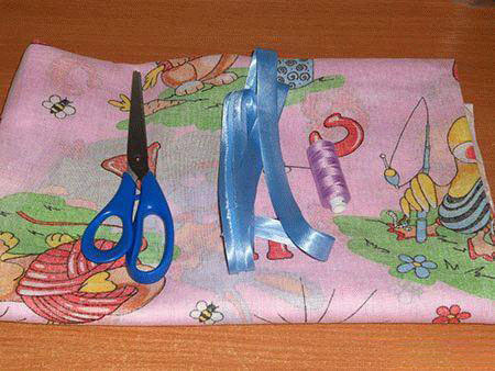 Требуемые материалы: Ткань (бязь, ситец, фланель) — полотно 80х80см (сложенное в два раза). Косая бейка в тон ткани – 2 метра. Нитки. Ножницы.