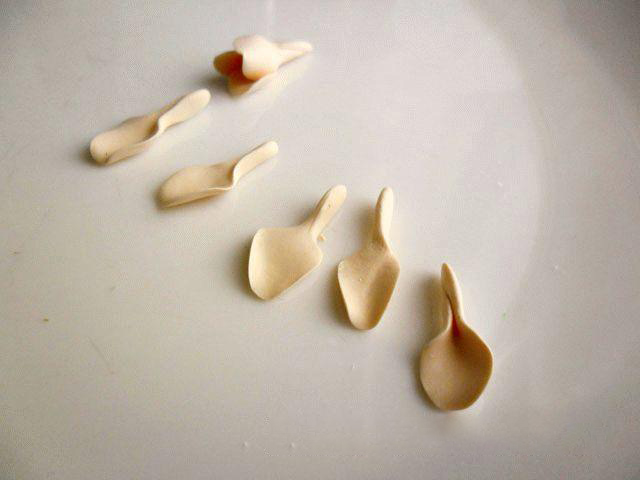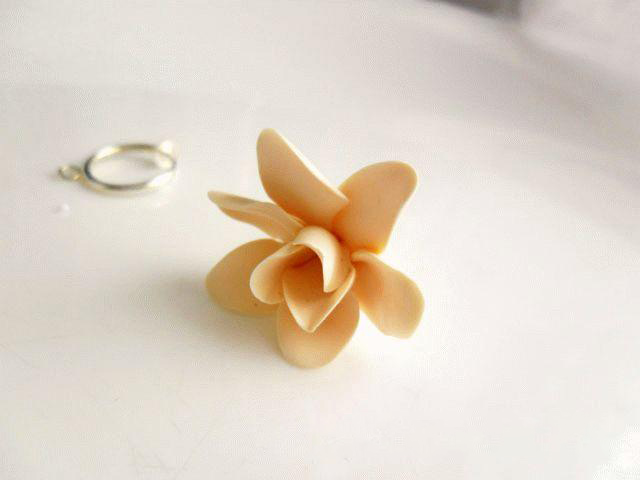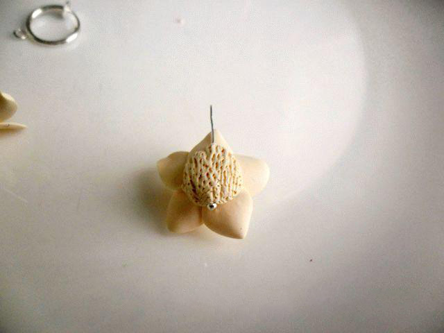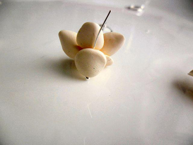 8. Собираем цветок по тому же принципу. Первый цветок для сережек из полимерной глины готов. Так же делаем и второй цветок. По окончании необходимо в обязательном порядке срезать острым лезвием хвостики, которые нам помогали складывать цветок в бутон. Затем цветочки отправляем на первое запеканке.