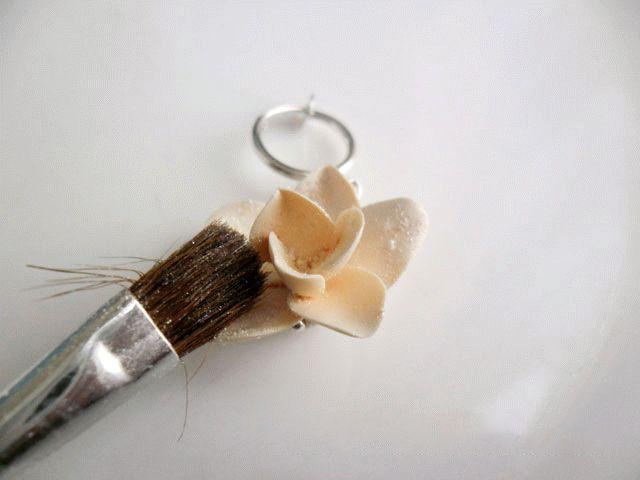 12. По окончании густо покрываем наши цветочные серьги перламутром и снова запекаем. Возможно применять для этих целей и обычные рассыпчатые светлые перламутровые тени – они ведут себя иногда ничуть не хуже, чем опытная пудра для творчества.