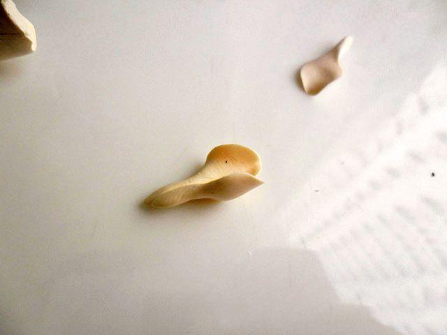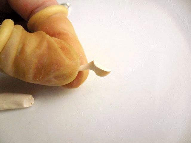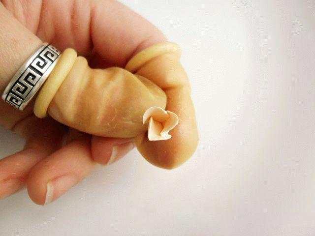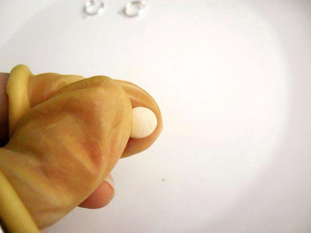 3. Сейчас надеваем медицинские перчатки, в противном случае на серьгах будут отпечатки пальцев, а это весьма некрасиво. Маленький кружочек пластики сжимаем пальцами, причем края кружка должны быть тоньше, чем его центральная часть.