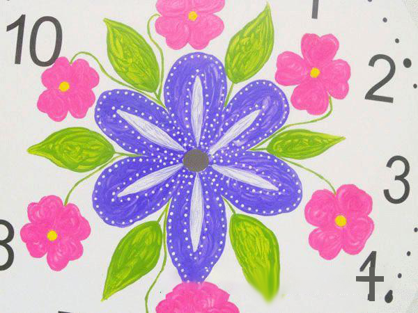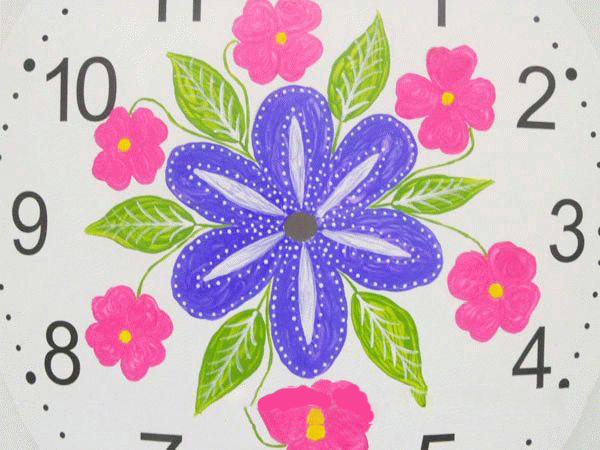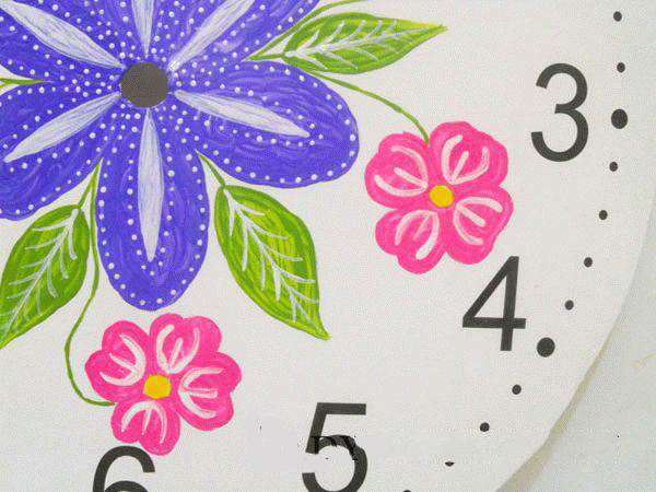 12. Акриловые краски высыхают быстро, исходя из этого уже через 10-15 мин. Возможно собрать часы и повесить их на приготовленное место. Вот так возможно оформить каждые обычные настенные часы своими руками и получить неординарный итог. По желанию возможно добавить элементы росписи и на внешнюю часть часов.