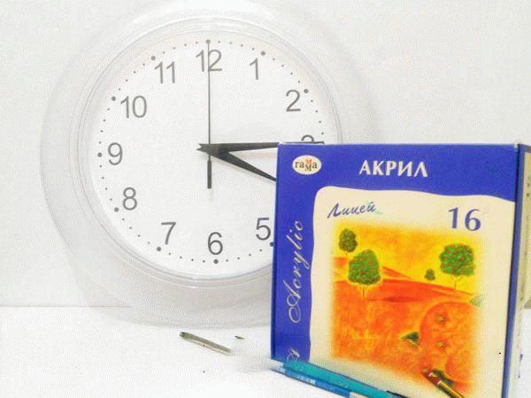 Собственно, часы (в данном мастер-классе мы будем применять простые часы из магазина ИКЕА, это самые простые настенные часы, которые весьма подходят для декорирования); акриловые краски для декоративно-оформительских работ; синтетические кисти (возможно применять каждые, но синтетические более упругие и ими легче работать); простой карандаш и ластик.