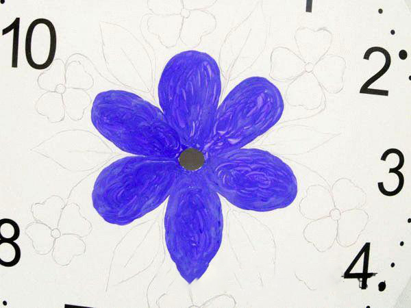 8. Сейчас, в то время, когда все элементы композиции наших часов раскрашены, начинаем оформлять их белым цветом. На лепестках центрального цветка рисуем немного расширяющиеся полосы, сначала проводя прямую линию в центре лепестка, после этого додавая в середине по обеим сторонам расширение.