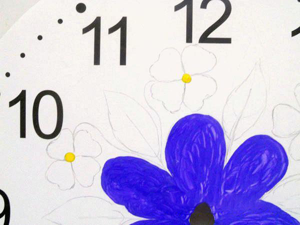 4. Серединки маленьких цветов раскрашиваем желтым цветом. Перед тем как приступить к работе с красками, лучше заблаговременно продумать применяемые цвета, чтобы они гармонично сочетались между собой, и, чтобы и общая композиция настенных часов подходила к интерьеру.