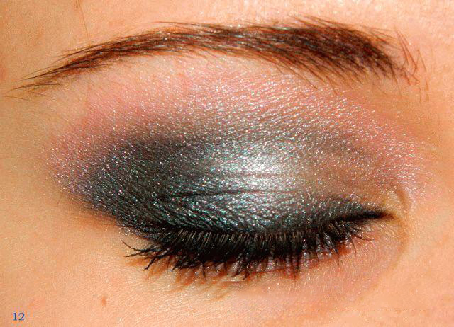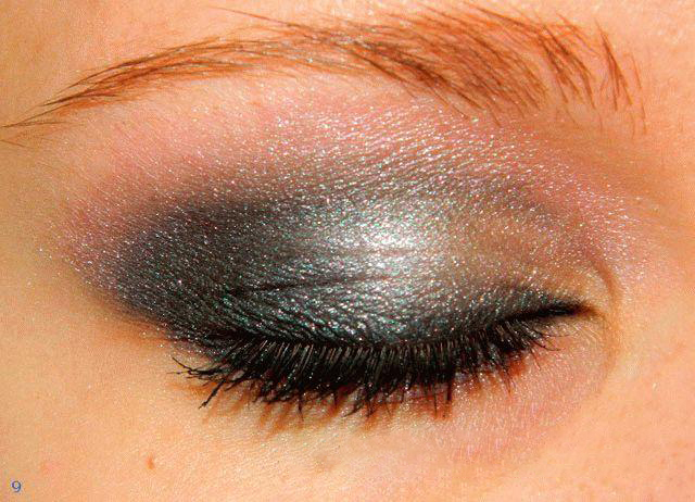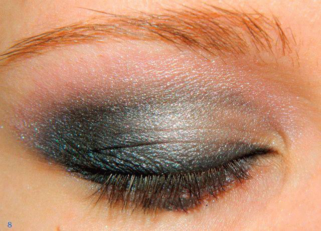 2. Другой стороной кисточки наносим чёрные тени, на противоположный угол и на ободок глаз (как подводку)