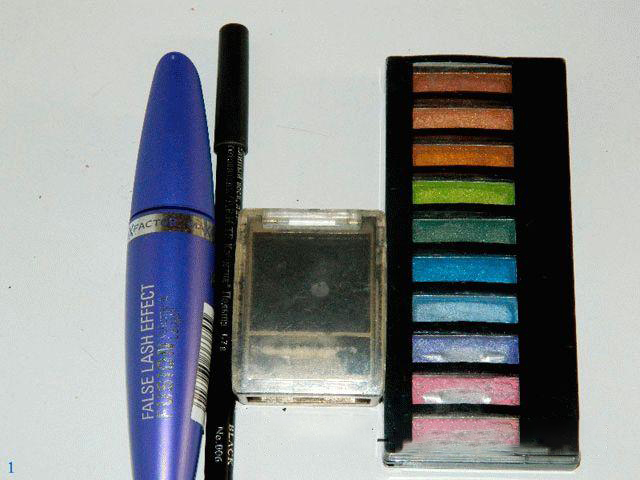 Для работы нам необходимо: палитра теней, включающая в себя такие цвета: чёрный, белый, светло-розовый (тени должны быть перламутровые); черная тушь; черный карандаш для глаз.