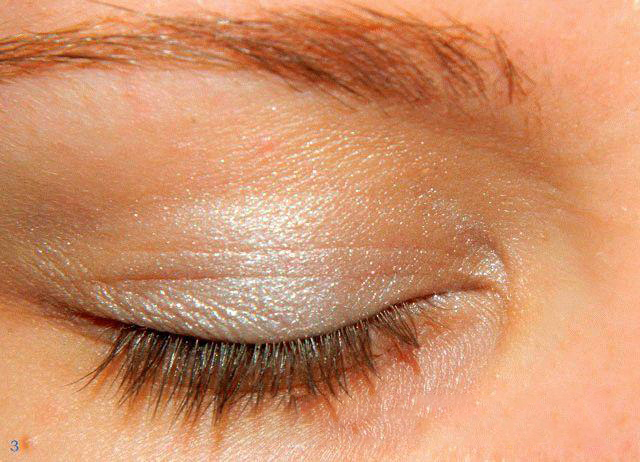 1. Сначала наносим светлые тона, другими словами берём кисточку, макаем её в белые перламутровые тени и наносим на уголки глаз, от носа.