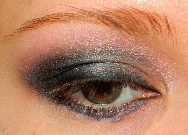 5. Розовыми тенями, мы смягчаем переход тёмных теней к светлым. Наносим их на середину век, на чёрные тени, и в большем количестве на плавный переход к коже от теней, как сверху, так и снизу