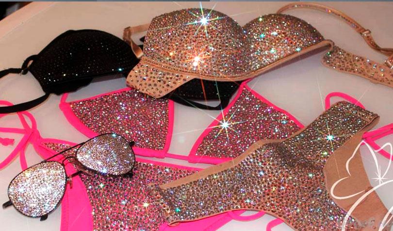 Не следует выбирать купальники, на которых есть разные узоры или рисунки, и наряду с этим еще и стразы. Дело в том, что на таком фоне стразы потеряются, а в некоторых случаях кроме того будут смотреться нелепо. Лучше выбирать купальники с однотонным цветом и стразами.