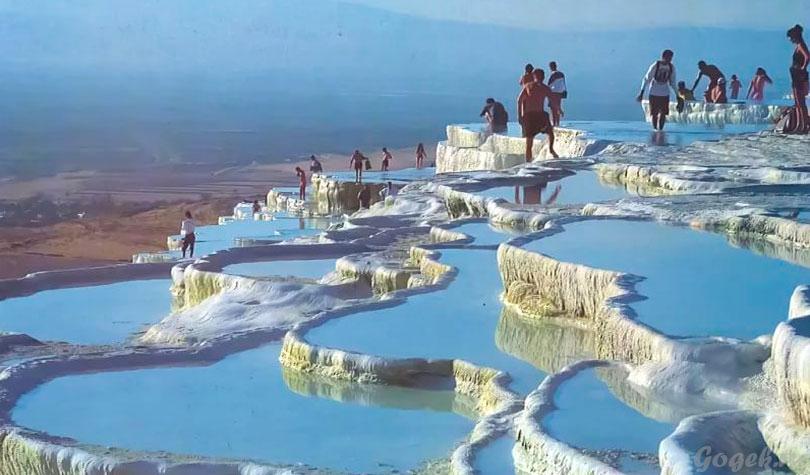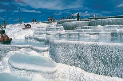 В Памуккале, что находится в Турции, собраны сразу 2 чуда света — город Хиераполис (античные развалины) и термальные ключи, уникальные. Температура воды там, около 40 градусов по шкале Цельсия, воздуха — 35, но выходя из воды — холодно.