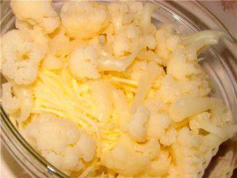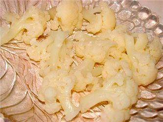 1. Цветную капусту нужно очистить от листьев, тщательно осмотреть, при необходимости, удалить потемневшие участки. Кочан поделить на маленькие соцветия. Вскипятить воду в кастрюле, подсолить ее по вкусу, положить соцветия капусты и варить их около 5 мин.. После этого капусту вынуть из воды и остудить ее.