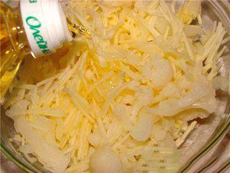 3. Одно яблоко очистить от кожуры и натереть на терке. Если применять терку для корейской морковки, у вас получатся длинные прекрасные полосы, которые станут украшением салата. Яблоко лучше брать красное, но не сладкое. Добавить получившиеся полосы к капусте и луку.