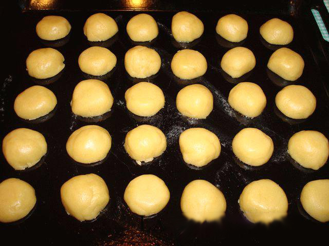 6. Духовку разогреть до 200° C. Противень легко смазать сливочным маслом. Любой шарик разрезать пополам и выложить плоской стороной на противень.