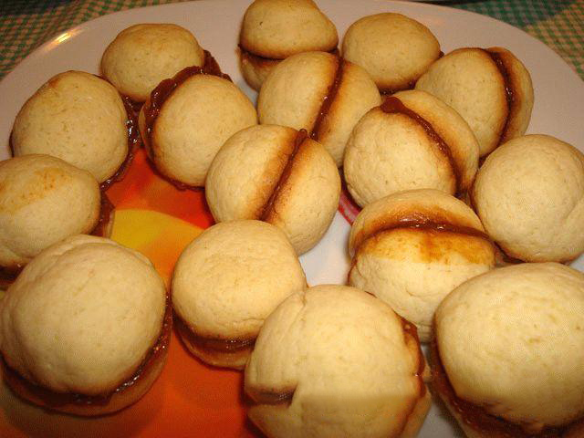 9. Наполнить получившиеся отверстия в половинках печенья вареной сгущенкой и склеить половинки совместно. Наше печенье уже начинает напоминать персики, осталось лишь раскрасить их.