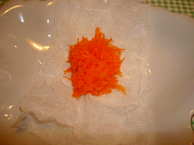 11. Бинт или марлю сложить в два слоя, на середину положить ложку моркови и свернуть в виде тампона. Аналогично сделать тампон со свеклой.