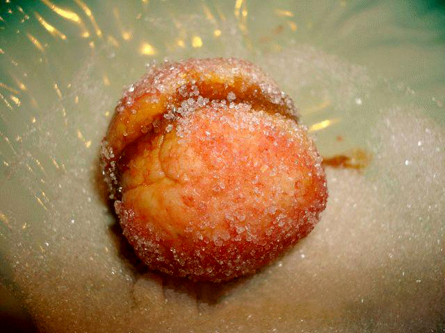12. В отдельную тарелку насыпать сахар. Сначала окрасить «персики» морковью, а затем сделать на каждом персике румяные бока с помощью свеклы. Пока печенье еще влажное, быстро обвалять в сахаре.