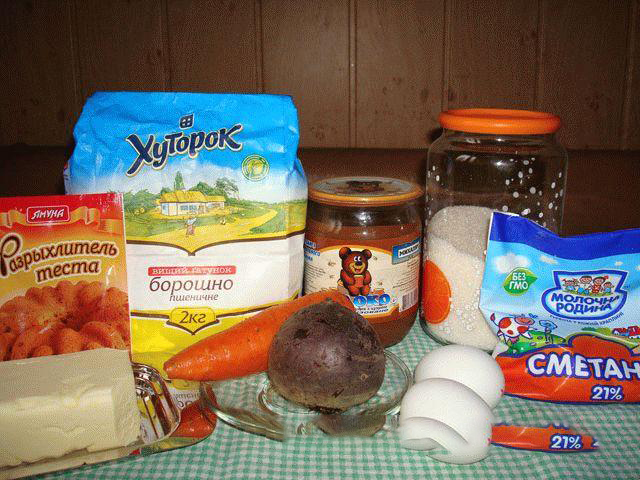 Ингредиенты: мука – 2,5 стакана; сахар-песок – 1 стакан + сахар для обваливания персиков; сметана 20% жирности – 2 ст. л.; масло сливочное – 100 г; сахар ванильный – 1 ч. Л.; яйца – 2 шт.; разрыхлитель – 1 ч. л. (возможно взять 1 ч. л. Соды, гашеной уксусом); вареное сгущенное молоко – 150-200 г; свекла маленькая – 1 шт.; морковь – 1 шт.