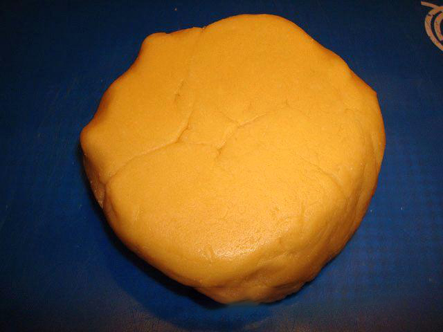 4. Просеянную муку смешать с разрыхлителем и добавить к яично-масляной смеси. Замесить однородное тесто. По консистенции тесто должно быть похоже на пластилин. В обязательном порядке завернуть готовое тесто в пленку и поставить в холодильник не меньше чем на 20 мин..