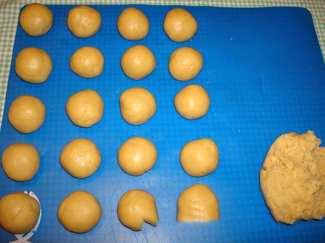 5. Из выстоявшегося теста скатать шарики величиной чуть больше грецкого ореха. Это будут заготовки под наши будущие персики.