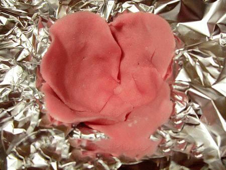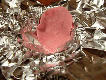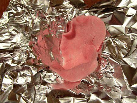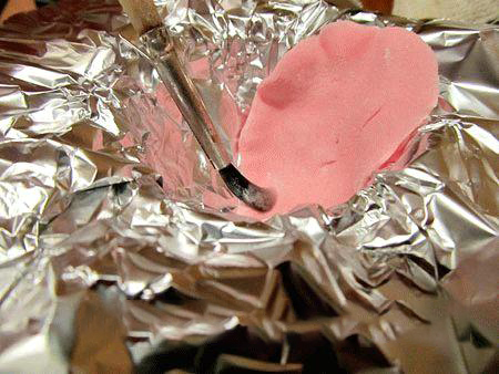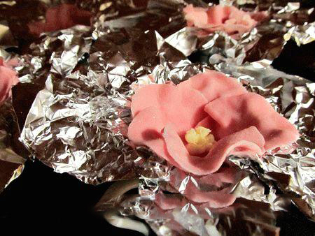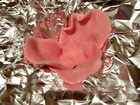 10. Помещать лепесток в форму из фольги необходимо так, чтобы дно было покрыто( это основа цветка). Для соединения с остальными лепестками, нужно кисточкой нанести на это место немного раствора желатина, сиропа или воды.