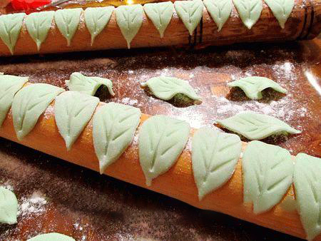 19. Чтобы сделать листики кроме этого возможно воспользоваться готовыми формочками или же вырезать ножом. Чтобы придать натуральный вид, нужно ножом сделать неглубокие бороздочки, согнуть руками по желанию или положить на скалку, посыпанную сахарной пудрой.