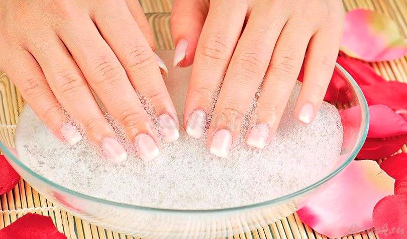 Эффективным домашним средством являются ванночки. Наиболее распространенный вариант – ванночка с добавлением морской соли. Данный ингредиент предпочтительнее покупать в аптеке. Она должна быть всецело натуральной и не содержать ароматических добавок. Чайную ложку продукта необходимо растворить в стакане горячей воды. Держать ногти в ванночке следует около двадцати мин..