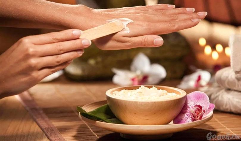 После этого добавляют пара капелек сандалового эфирного масла и тщательно перемешивают. Маску необходимо наносить на чистую кожу, после этого обмотать руки полиэтиленовой заготовкой или перчатками, полотенцем и подождать 15 мин.. Остатки хорошо убираются обычной салфеткой.