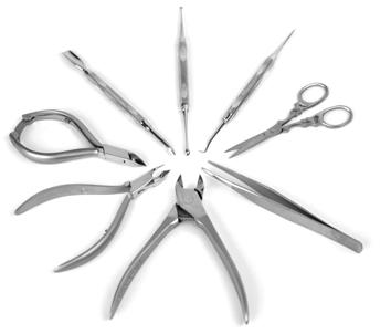 Ножницы прямые и скругленные. Накожники. Кусачки для обработки кутикулы. Пилочки, они смогут быть железными с рифлением или напылением, стеклянными или изготавливаться из других материалов. Лопаточки для аккуратного отодвигания кожи вокруг ногтей. Пинцеты для бровей. Тример для обрезки кутикулы. Шабер – приспособление для обрезки толстых ногтей, больше популярен среди мужчин. Какими должны быть инструменты для маникюра